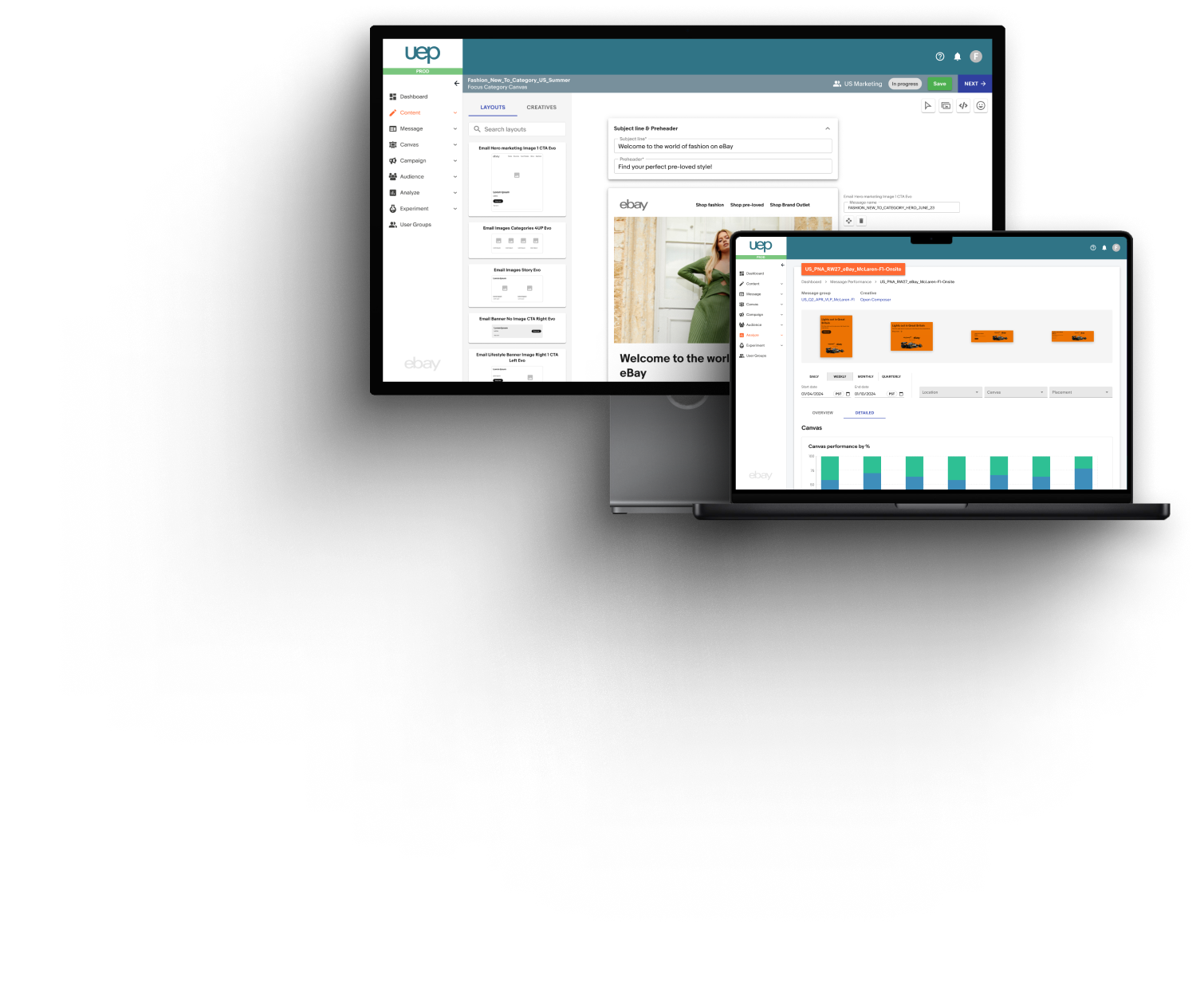 In 2020, after the launch of the new eBay Partner Network portal, I was recruited to join eBay's marketing tech team to help them build the Unified Experience Platform (UEP). UEP aimed to be a one-stop communication platform for marketers, enabling them to: