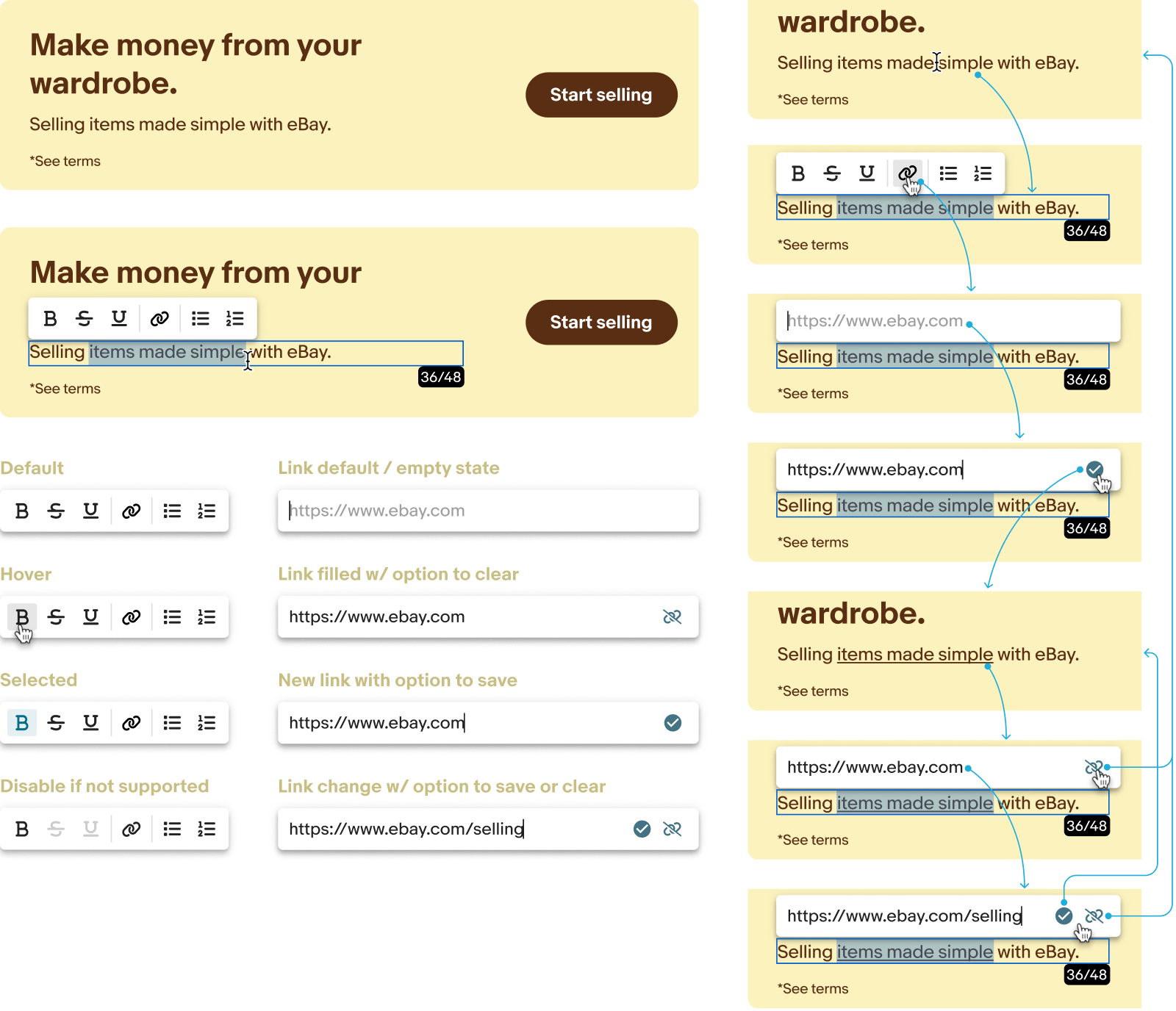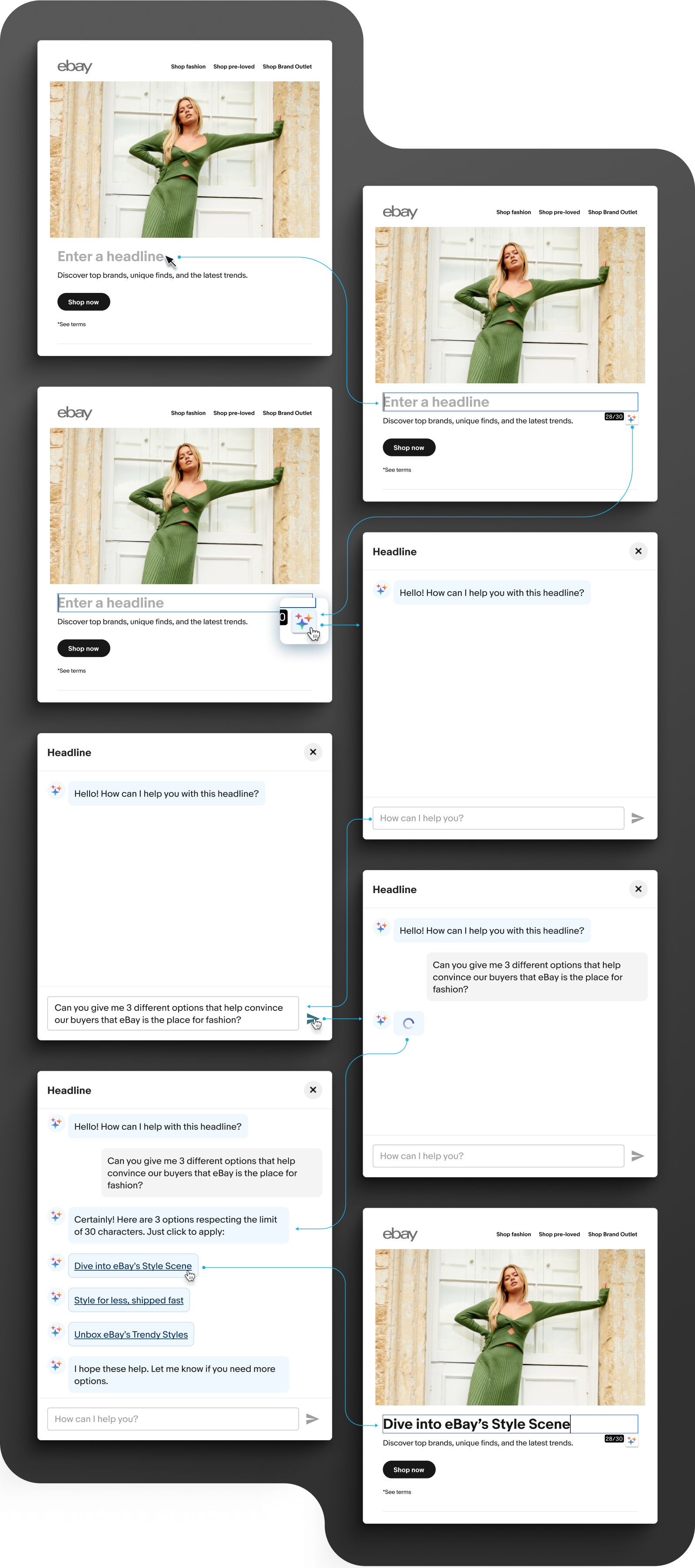 The Unified Experience Platform team paired up with eBay's incredible in-house AI team to help us deliver our first AI content generation capabilities. The goal was to scale content creation while maintaining eBay's tone, voice, and creative guidelines. Starting with text-based creatives, the system leveraged eBay’s proprietary language models to: