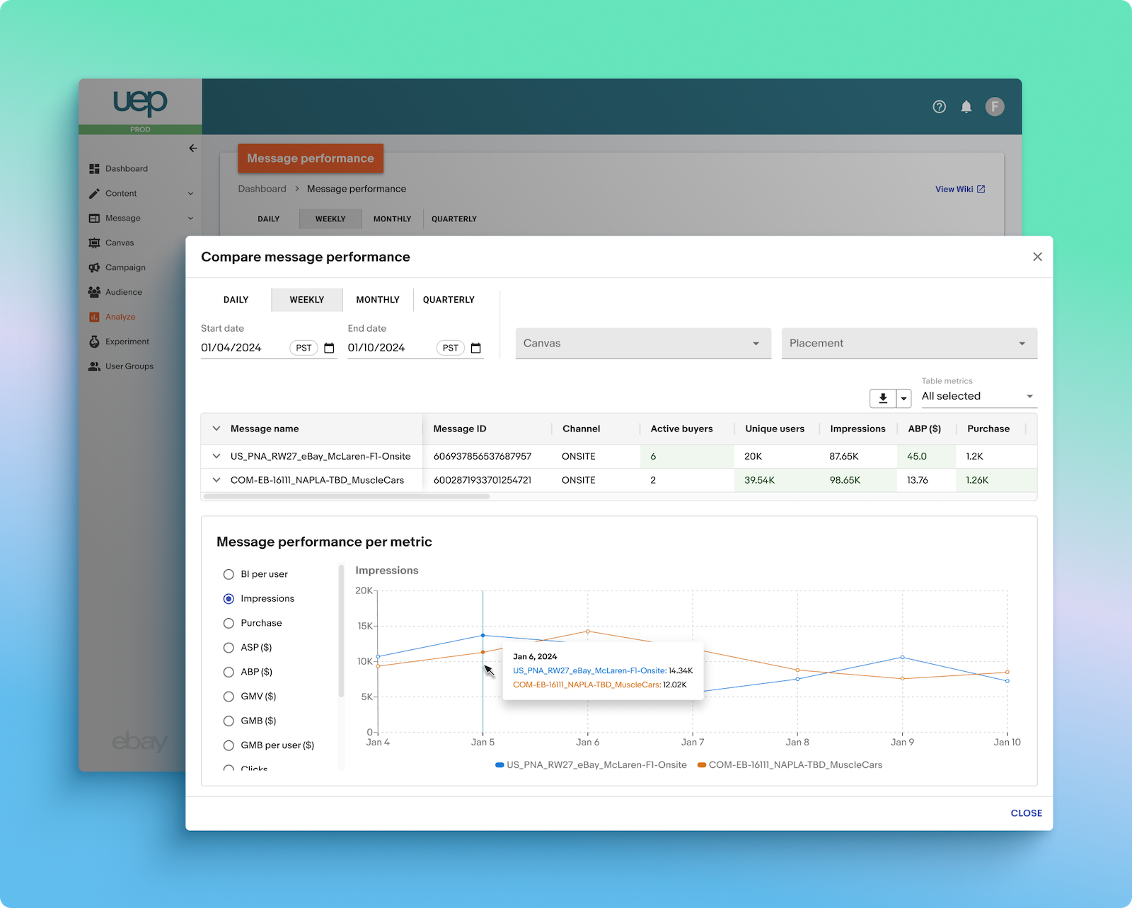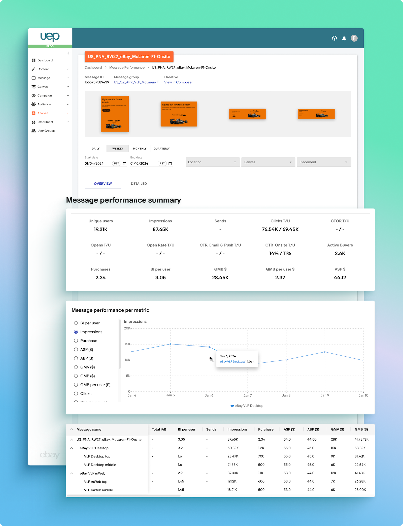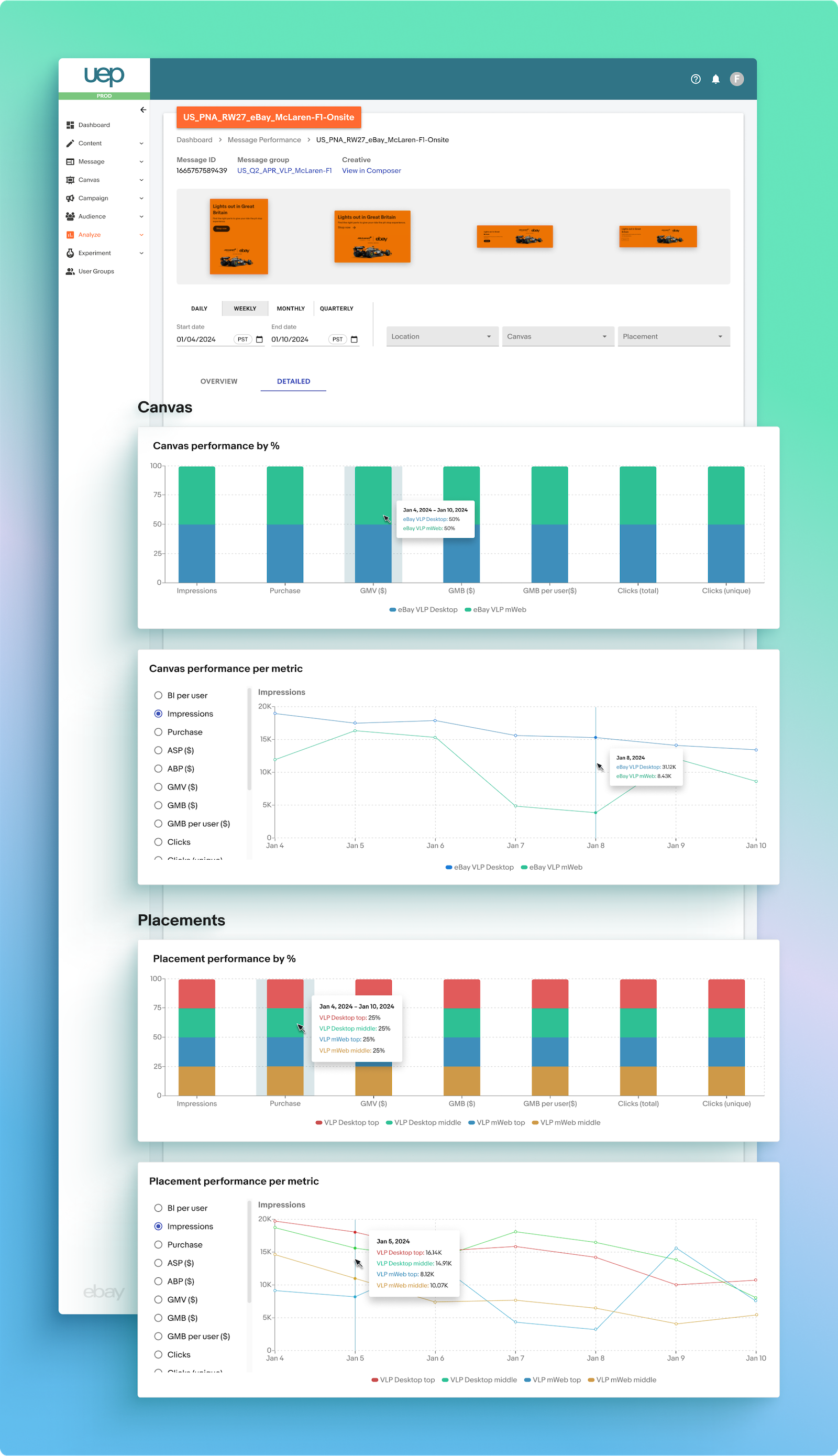 The first tool for performance reporting was Message Reporting, which showed our marketers how the messages they created and placed on eBay’s on-site webpage, app, or email were performing. Key features included: